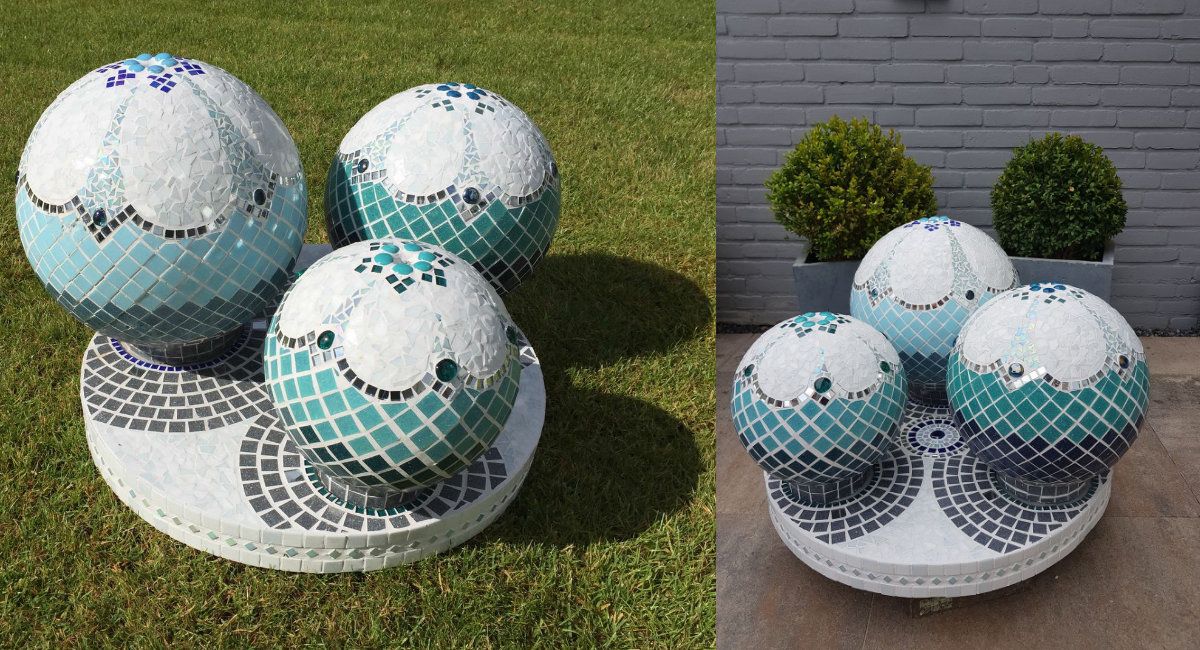 Wij hebben voor deze opdracht gebruik gemaakt van een betonnen waterornament met massief betonnen bollen met een omtrek van 30, 35 en 40 cm die op een ronde plaat staan van 60 cm.