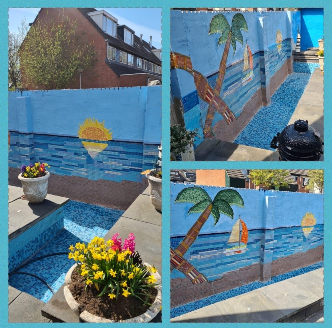 Een saaie muur omtoveren tot een tropisch paradijs. Een vraag die we nog niet eerder gehad hadden maar waarvoor we de uitdaging niet uit de weg gingen. Een kleurrijk geheel is het geworden waarbij de bewoner zelf ook stukken mozaïek gedaan heeft.