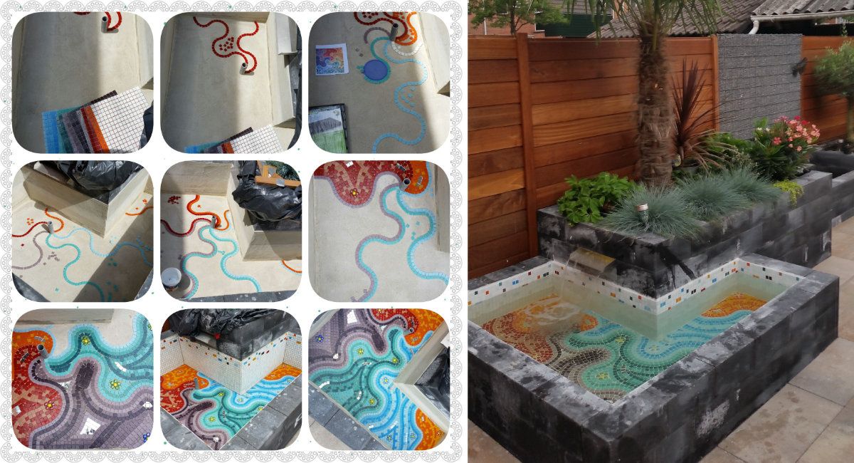 De wens was een waterbak met als thema ‘Gaudi’. Deze mensen waren weg van de mooie kleuren en vormen die Gaudi gebruikt in zijn mozaïek werken. Met glasmozaïek en speciale waterbestendige lijm zijn we aan de slag gegaan. Na een paar weken was dit het eindresultaat.